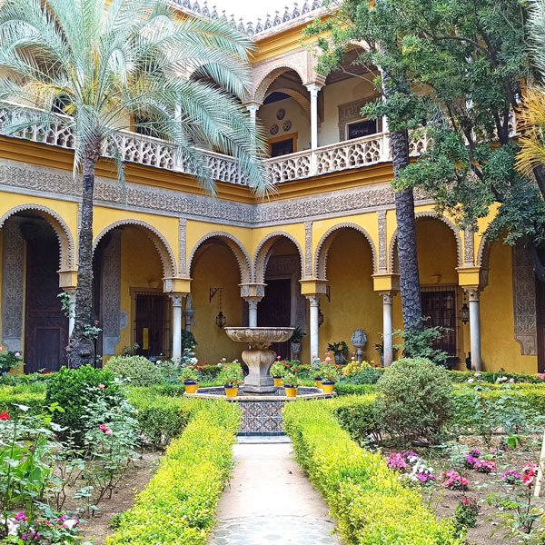 Le palais est resté dans un état de conservation exceptionnel car il a été habité en continu par la famille jusqu'à récemment. On découvre les 21 patios et jardins luxuriants typiques de l'architecture sévillane, avec leurs fontaines de faïence, leurs orangers parfumés, leurs bougainvillées colorées et leurs azulejos anciens. L'atmosphère est celle d'une demeure aristocratique authentique, pas d'un musée froid. C'est aussi la maison natale du poète Antonio Machado (1875), figure majeure de la littérature espagnole.